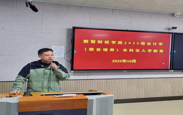 为帮助 2025级会计学(联合培养)本科生快速适应大学生活、明确专业发展方向,10月21日,数智财经学院在C304教室隆重举办新生入学教育大会。本次大会特别邀请安徽建筑大学经济管理学院院长彭志胜教授作主题报告,2025届会计学(联合培养)本科毕业生、现就职于华为慧通的柳海鹏分享职业规划经验,会议由数智财经学院副院长(主持工作)毛德成主持,2025级全体新生及辅导员参会。