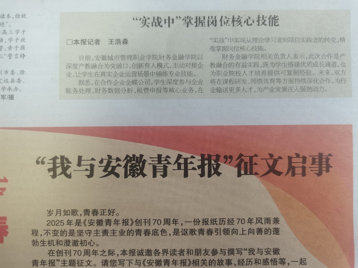 此次产教融合教学改革成效显著,学生在各类财经技能竞赛中的获奖率较大提升,毕业生就业率与就业质量均大幅提高,相关案例得到社会广泛认可,2025年5月被《安徽青年报》宣传报道,为职业教育校企协同育人提供了可复制、可推广的有益借鉴。