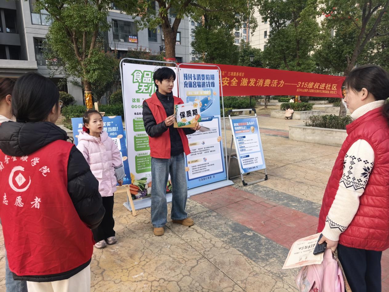 在3·15国际消费者权益日将至之时,为普及消费维权知识、守护居民“舌尖上的安全”,营造安心舒心的消费环境,2026年3月13日16时,数值财经学院志愿者联合社区工作人员开展“激发消费活力 守护居民权益”主题宣传活动。志愿者与社区工作人员携手,以趣味互动形式将维权知识送到居民身边,让普法宣传更接地气、更入人心。