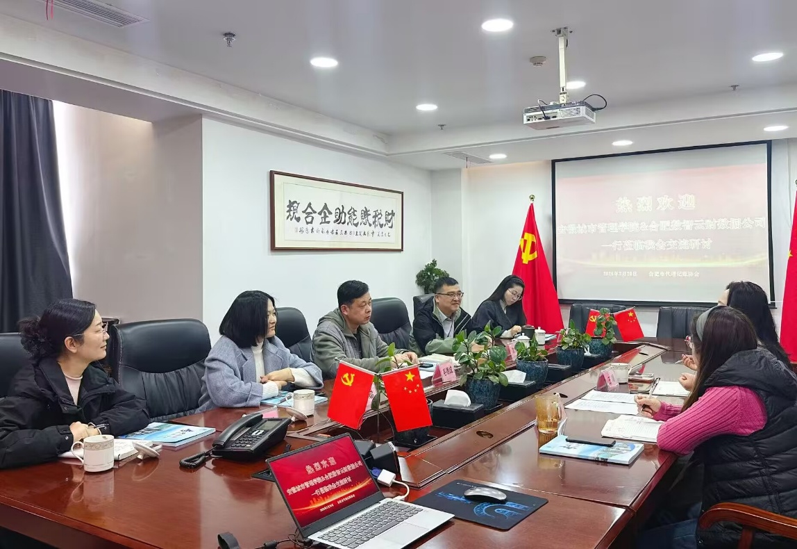 3月20日,我校数智财经学院副院长毛德成率教师团队(李菊娣、赵秋瑾、姚尚丽)赴合肥市代理记账协会开展座谈交流。协会会长王靖、秘书处余玲玲接待了学院一行,合肥数智云财数据科技有限公司总经理沈勇也参加座谈交流。
